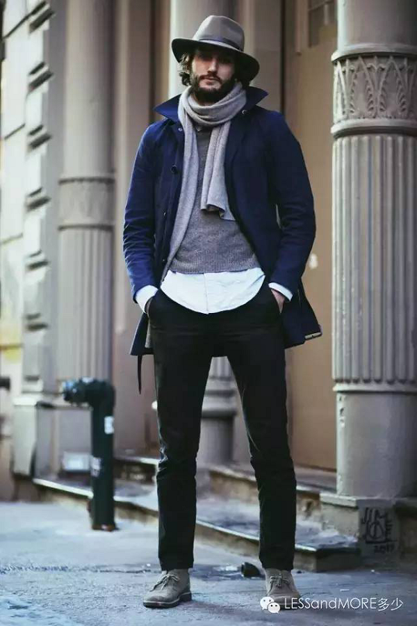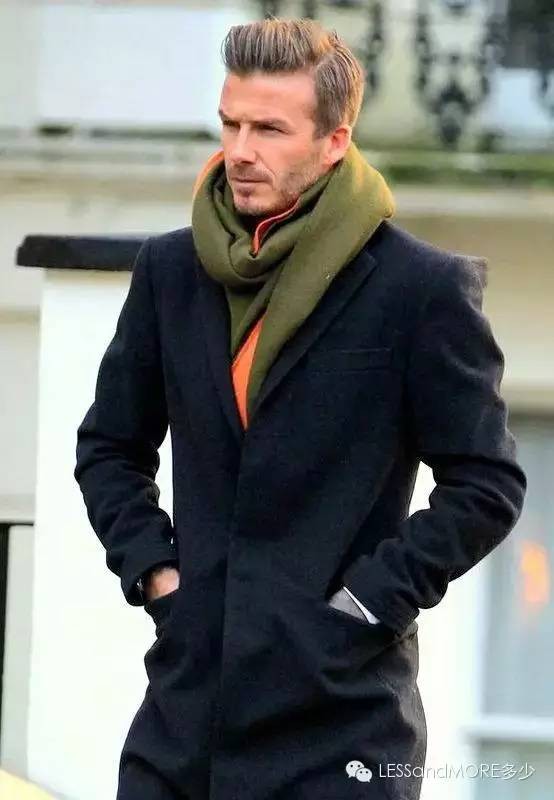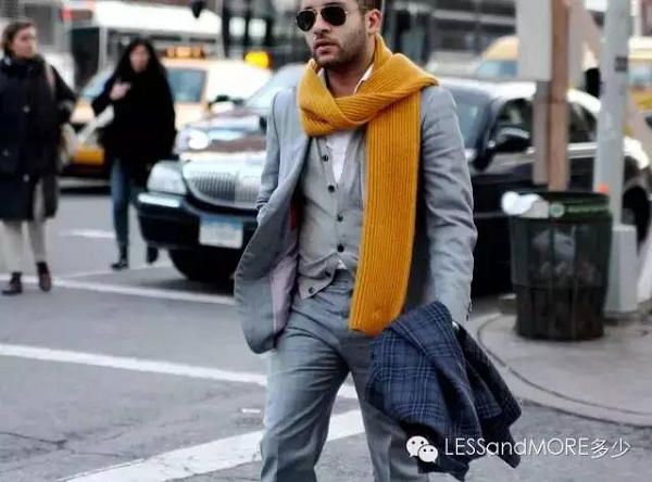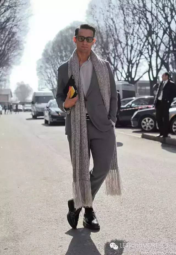 身高不高的男士,要選擇中長款的圍巾來做垂掛式的戴法,圍巾兩端剛過腰帶處為宜,否則會有拖沓和比例失調之感。