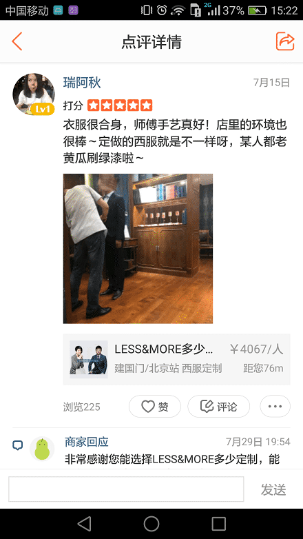衣服很合身,師傅手藝真好!店里的環(huán)境也很棒~定做西服就是不一樣呀,某人都老黃瓜刷綠漆啦~